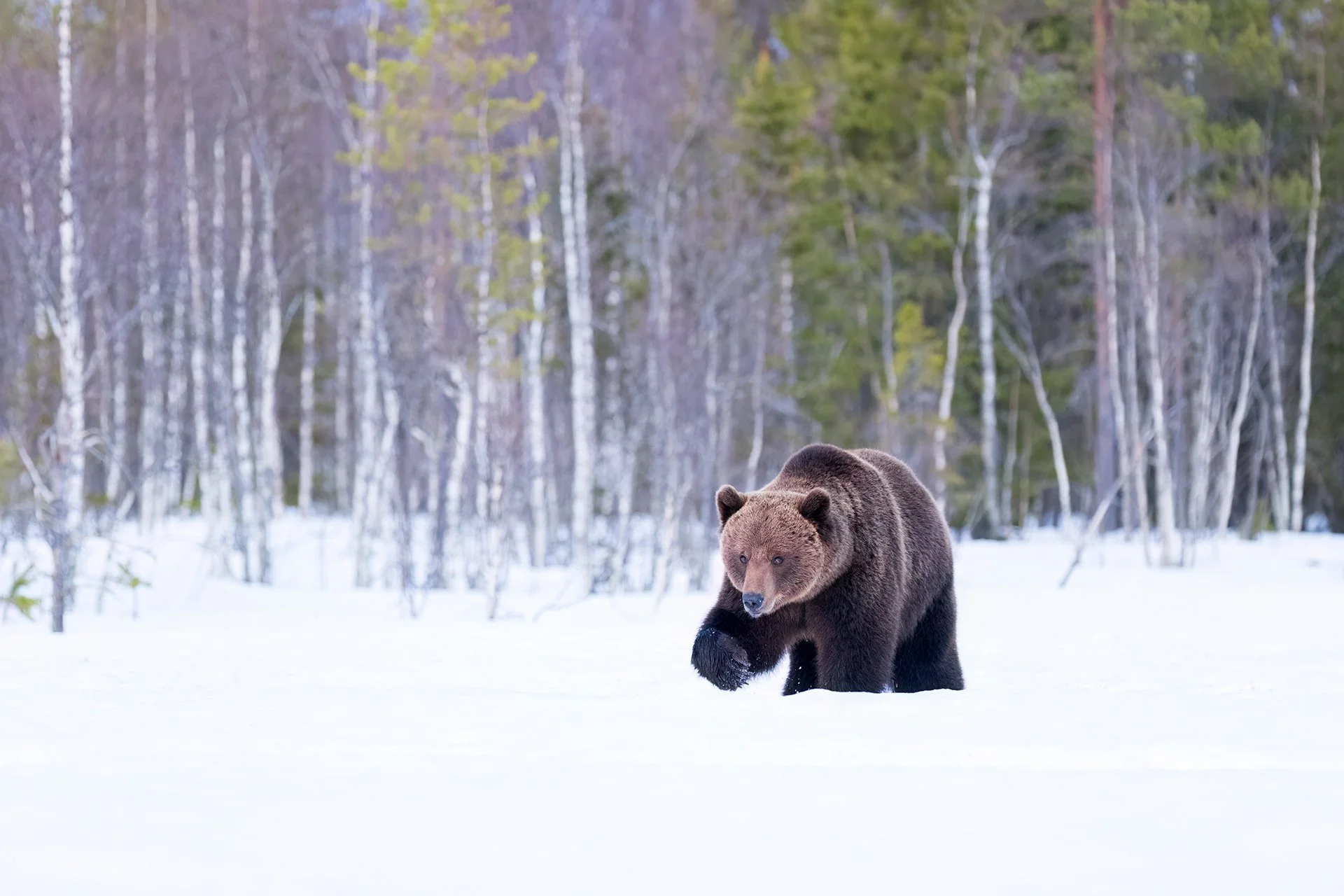 In April – just as the brown bears comes out of hibernation – the taiga in northern Finland is still snow covered. Although there is no guarantee to see bears this early in the season, I still went to the north eastern part of Finland nearby the Russian border hoping to get an image of this stunning mammal in the snow. One evening as the sun was about to set, I got lucky as this huge bear came out of the forest and approached in my direction.
