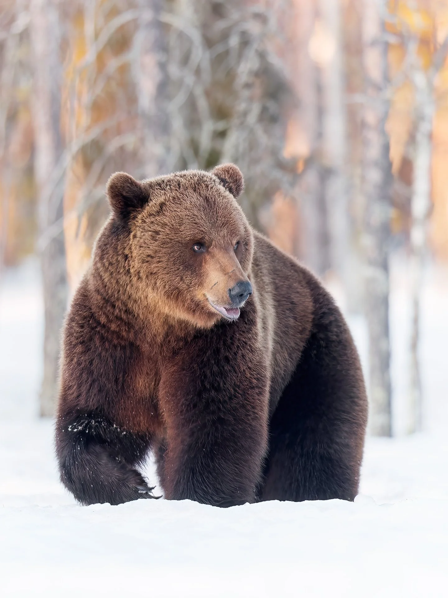 In April – just as the brown bears emerge from hibernation – the taiga in northern Finland is still covered in snow. Although there is no guarantee of seeing bears this early in the season, I travelled to the northeastern part of Finland near the Russian border, hoping to capture images of this magnificent mammal in the snow. One evening, as the sun was about to set, I was lucky: a huge bear came very close to the hide and paused for a while in a perfect position.
