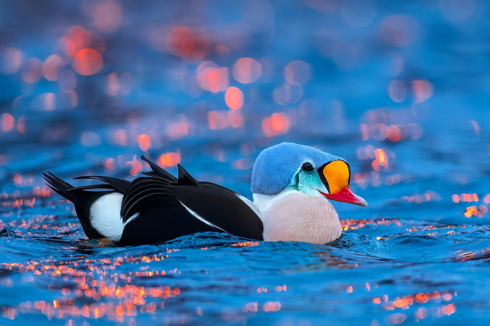 The main attraction for me was the opportunity to capture images of the spectacular King Eiders. Each morning, I had access to an excellent floating hide in the harbour, with openings right at the water surface. This gave me a wonderful opportunity to photograph this beautiful King Eider at eye level as it swam close by.