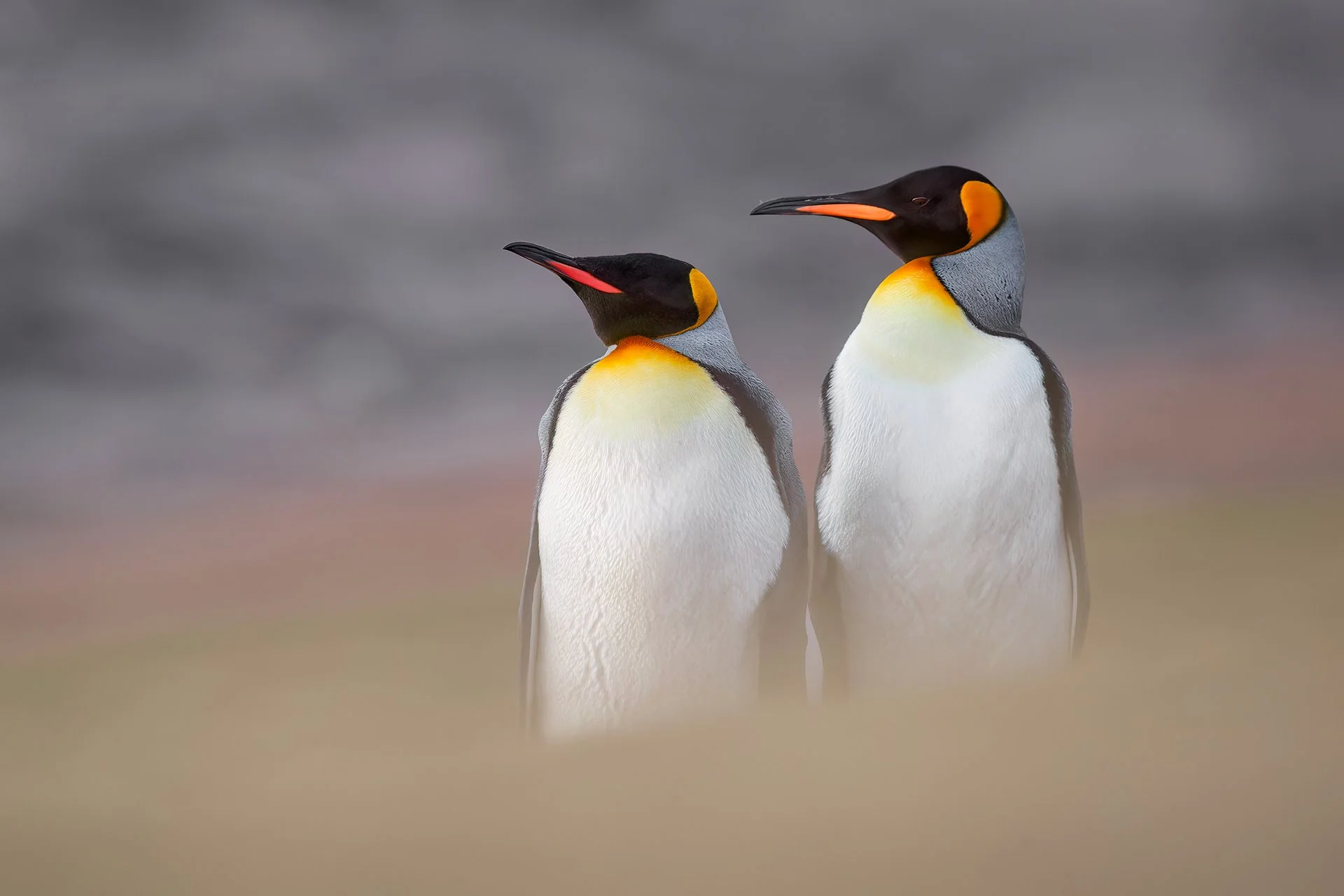 On Saunders Island in the Falklands, there is a small colony of King penguins. Most of the time, they stand together in a group down by the beach. However, one evening, as I was returning from the cliffs at sunset, these two King penguins had left the group and were standing on a hillside. I took advantage of the opportunity and lay down in the grass to create a dreamy atmosphere in the image.