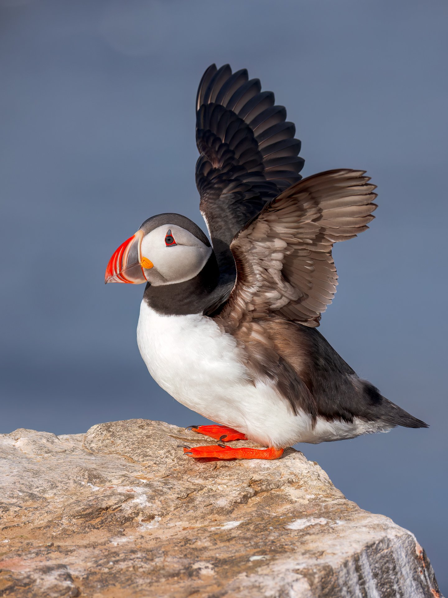To photograph puffins was the main reason for me going to the island of Grimsey by the Arctic Circle. They are found on the cliffs around the edges of the small island and this one raised its wings with the blue sea as a background.