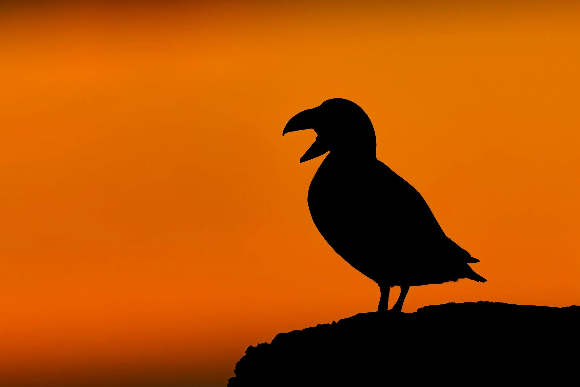 On a trip to Grimsey in Iceland, I had hoped to capture a silhouette image of a puffin against the setting sun. The opportunity came on the last evening at midnight when the almost-setting sun — it does not fully set at this time of year — created a beautiful red sky. Fortunately, a single puffin was standing by the cliffs of Basavik in the northern part of the island and even gave me an open beak pose.